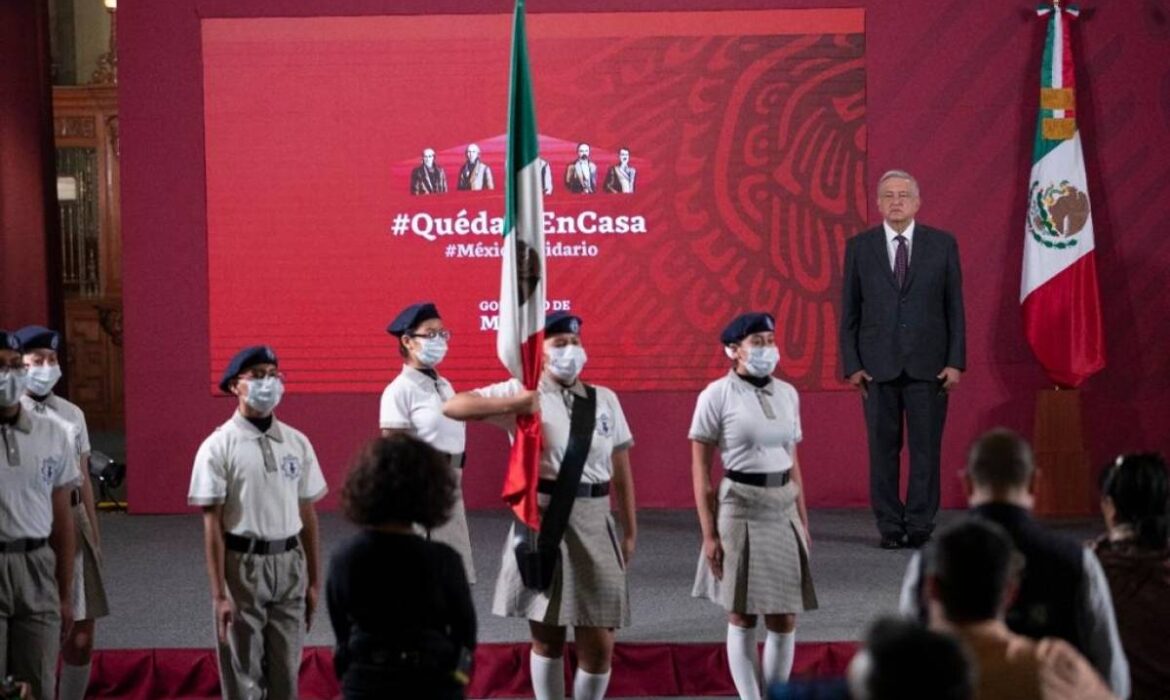 López Obrador encabezó una ceremonia de Honores a la Bandera junto con el secretario de Educación Pública (SEP), Esteban Moctezuma. Entonaron el Himno Nacional frente a una escolta de jóvenes que, con cubrebocas, resguardaron el lábaro patrio.