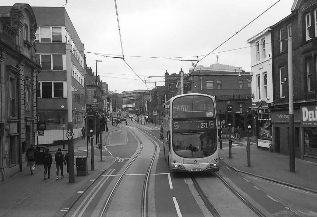 Así que no me pueden juzgar por no haber notado que estaba yo en una chan ruta Pensiones-Centro versión inglesa. (Foto principal de Alma Burgos Simón, un autobús en Sheffield).