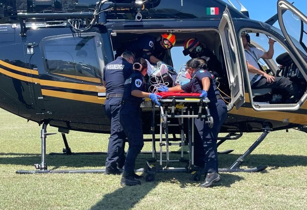 Mérida, Yucatán, 29 de marzo de 2022.- Un joven cuyo estado de salud es grave fue trasladado hoy de Valladolid a Mérida a bordo del helicóptero Bell-429 de la Secretaría de Seguridad Pública.
