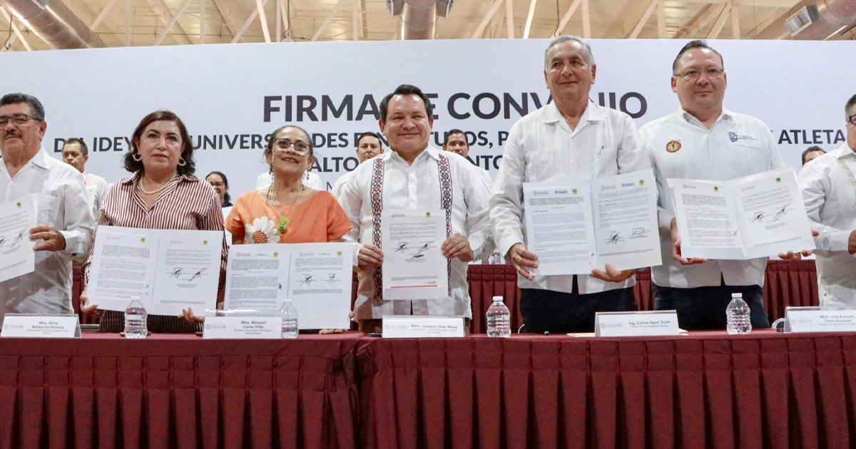 Mérida, Yucatán, 31 de Enero de 2025. – El Gobierno del Estado de Yucatán, encabezado por Joaquín Díaz Mena, firmó un convenio con 29 universidades públicas y privadas para otorgar becas de entre 10% y 50% en colegiaturas e inscripciones a deportistas, trabajadores y familiares del Instituto del Deporte del Estado de Yucatán (IDEY). El acuerdo se formalizó en el Multigimnasio “Socorro Cerón” del Complejo Deportivo Kukulcán.
