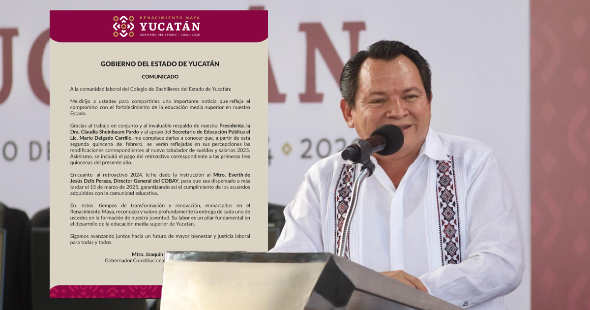 El mandatario estatal indicó que esta medida cuenta con el respaldo de la Presidenta Claudia Sheinbaum Pardo, y del secretario de Educación Pública, Mario Delgado Carrillo. Además, instruyó al director general del Cobay, Everth Dzib Peraza, a garantizar el pago del retroactivo de 2024 antes del 15 de marzo.