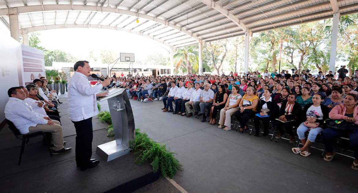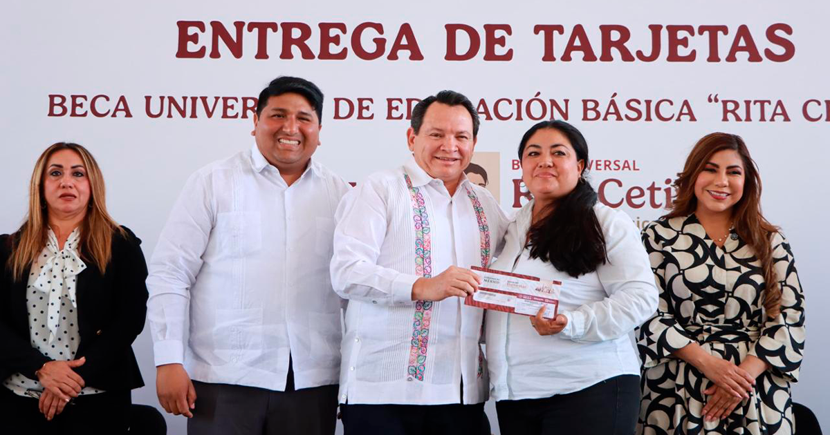 Mérida, Yucatán, 11 de marzo de 2025.- El Gobernador Joaquín Díaz Mena entregó tarjetas de la beca universal de Educación Básica «Rita Cetina» a 654 estudiantes de la Escuela Secundaria Técnica No. 66 y 80 en Yucatán. Este apoyo otorga 1 mil 900 pesos bimestrales por familia y 700 pesos adicionales por cada estudiante de secundaria inscrito en escuelas públicas.