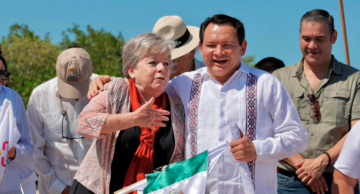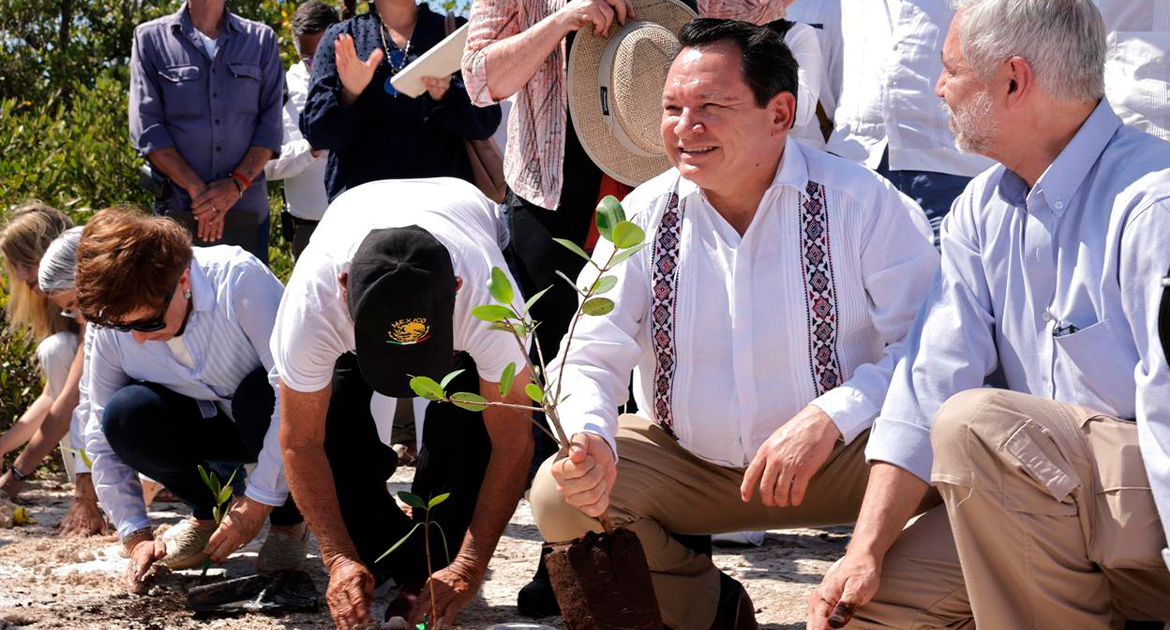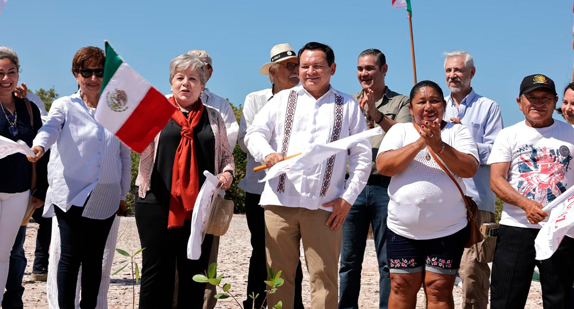 Alicia Bárcena Ibarra señaló que Yucatán ha perdido el 30 por ciento de sus bosques y reservas forestales, incluidos los manglares, por lo que la reforestación es crucial para la reproducción de especies marinas y la protección costera. El evento contó con la presencia de autoridades locales y federales.