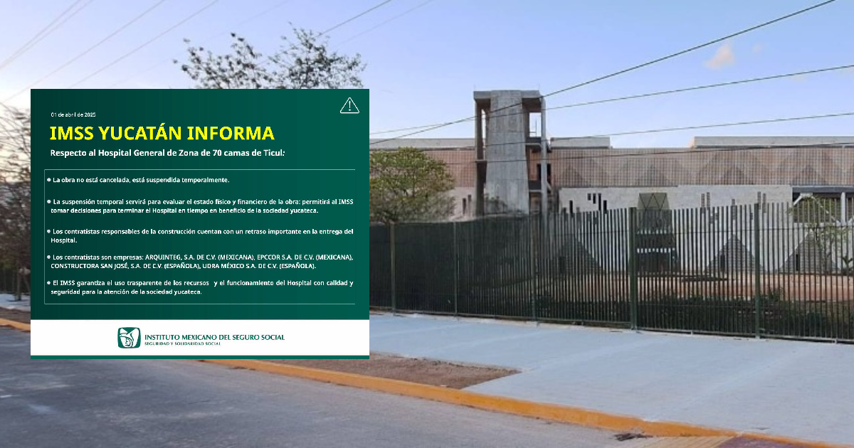 La suspensión responde a los retrasos en la entrega por parte de los contratistas responsables: Arquinteg S.A. de C.V., Epccor S.A. de C.V., Constructora San José S.A. de C.V. y Udra México S.A. de C.V. El IMSS analizará cómo garantizar la conclusión de la obra en beneficio de la población yucateca.