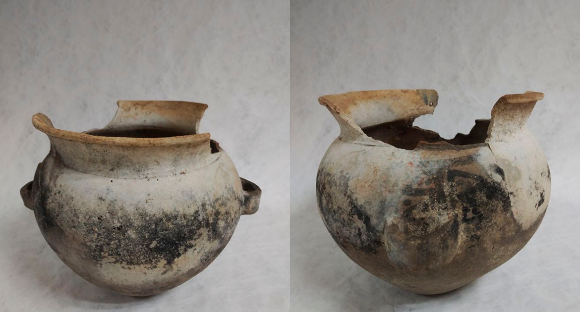 La pieza data del periodo Posclásico tardío (1200-1550 d.C.) y conserva dos asas con decoración geométrica en negro. Presenta daños en el cuello y bordes, además de concreciones calcáreas que ocultan parte de su diseño. Requerirá procesos de limpieza y restauración para determinar su tipología exacta.