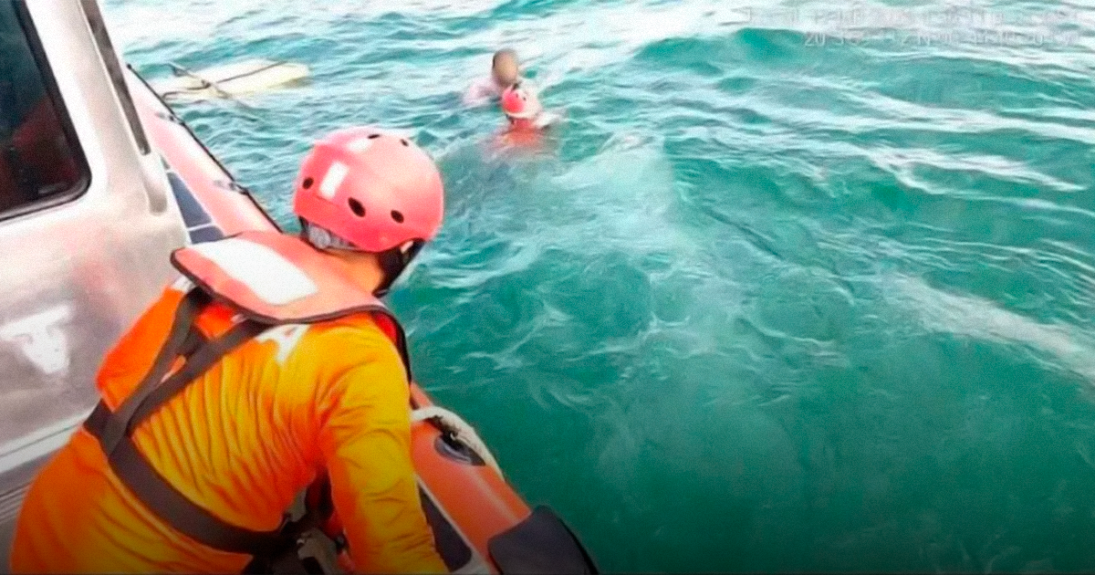 Una embarcación tipo Defender acudió al lugar tras recibir el reporte. Los rescatistas localizaron a un tripulante que ya había sido auxiliado por otra lancha, mientras los seis restantes se mantenían a flote sujetándose de la tapa de una hielera que funcionó como salvavidas improvisado.