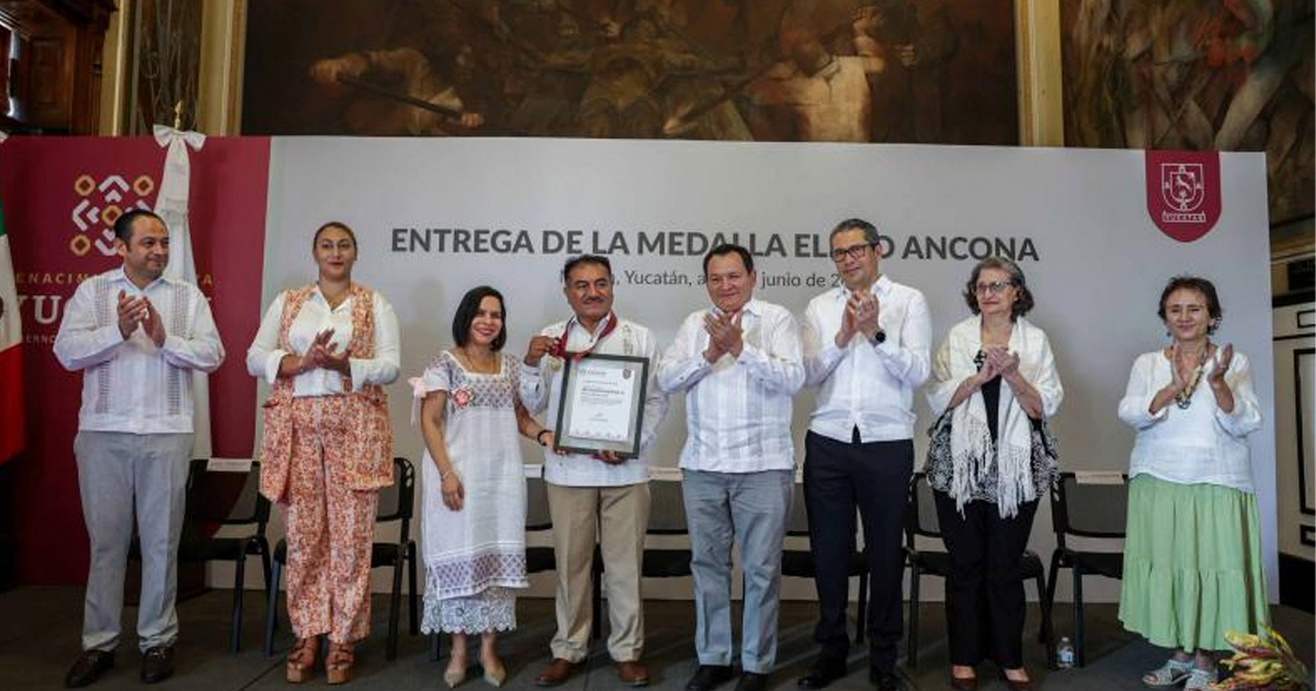Mérida, Yucatán, 18 de junio de 2025.- El Gobernador Joaquín Díaz Mena entregó la Medalla Eligio Ancona al doctor Fidencio Briceño Chel en reconocimiento a su labor en la preservación de la lengua y cultura maya.