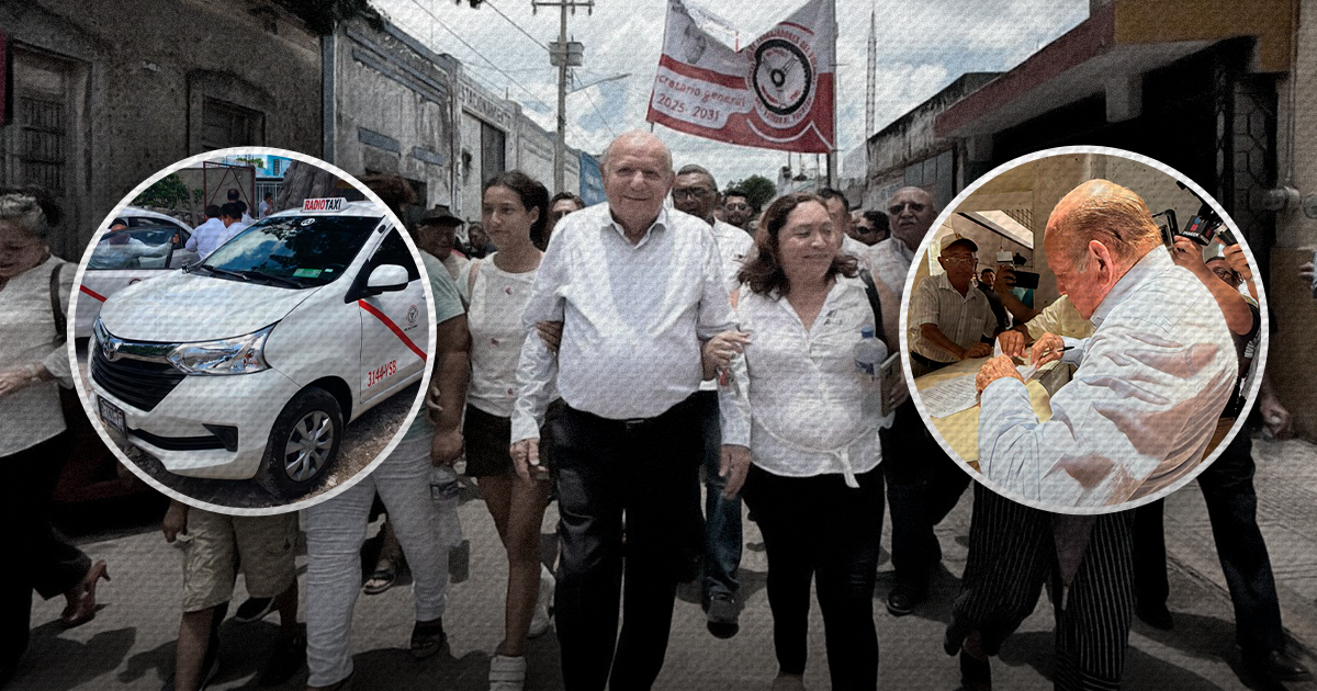 Una charanga interpreta El Rey y Nerio Torres Ortiz levanta las manos. Decenas de taxistas lo rodean a las puertas de la terminal de Tetiz-Kinchil. “¡Arriba Nerio!”, se oye en un altavoz. “¡Fuera Billy!”, secundan varias voces.