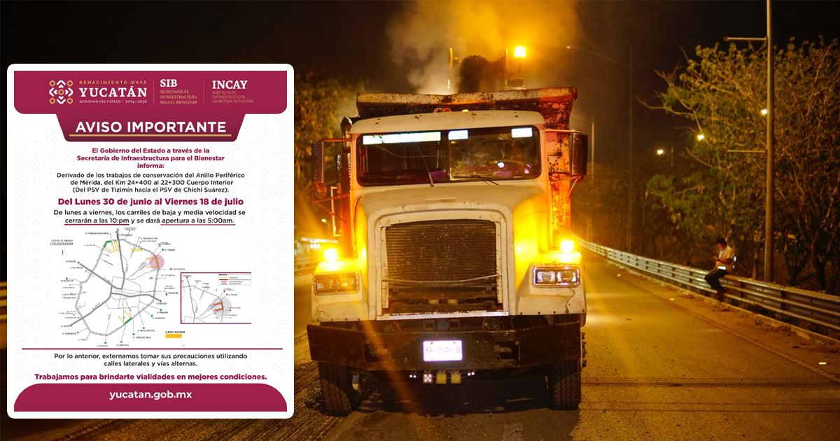 El Incay anunció que continuará con labores de mantenimiento en el cuerpo interior del Periférico, desde el PSV de Tizimín hasta el PSV de Chichí Suárez. Los trabajos se realizarán del 30 de junio al 18 de julio, en horario de 22:00 a 05:00 horas.