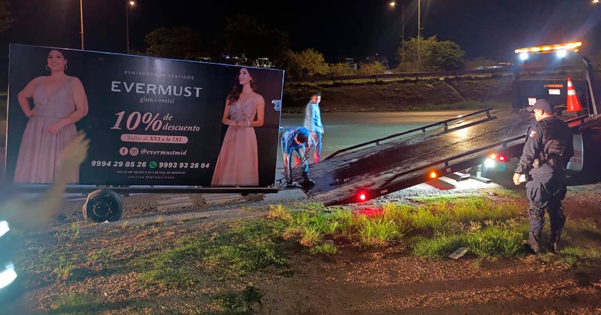 Mérida, Yucatán, 5 de julio de 2025.- El Ayuntamiento de Mérida retiró 26 estructuras publicitarias colocadas sin permiso en una avenida del norte de la ciudad. El operativo se realizó en la madrugada del sábado entre las plazas City Center y La Isla.