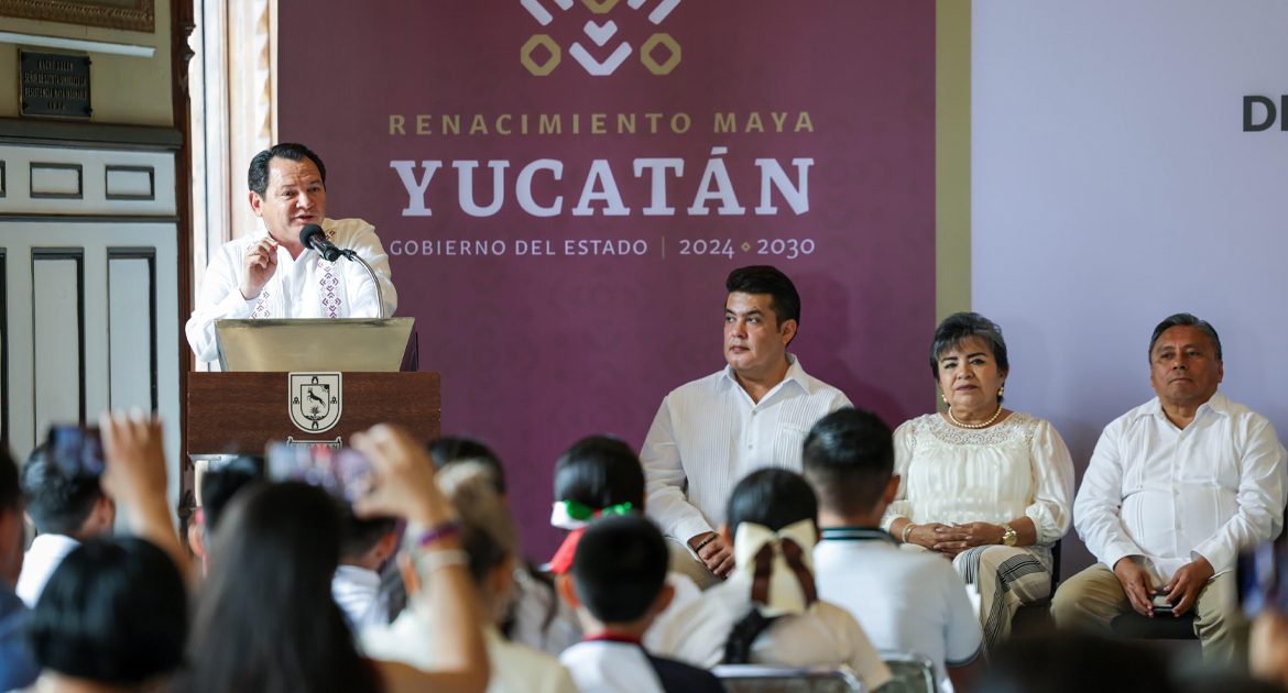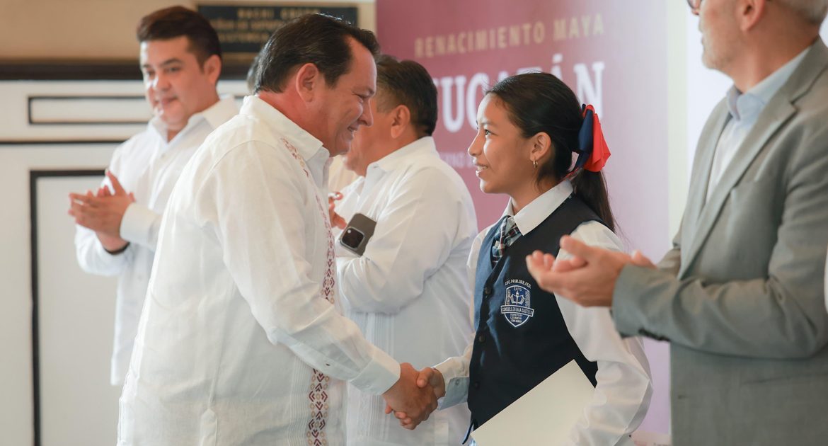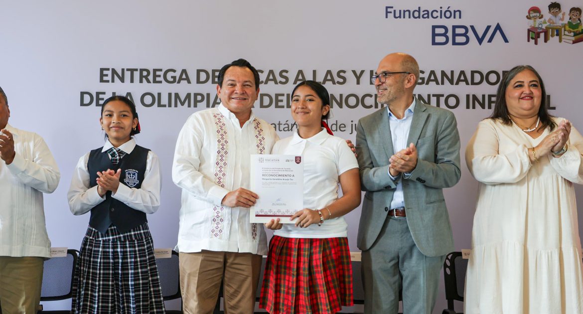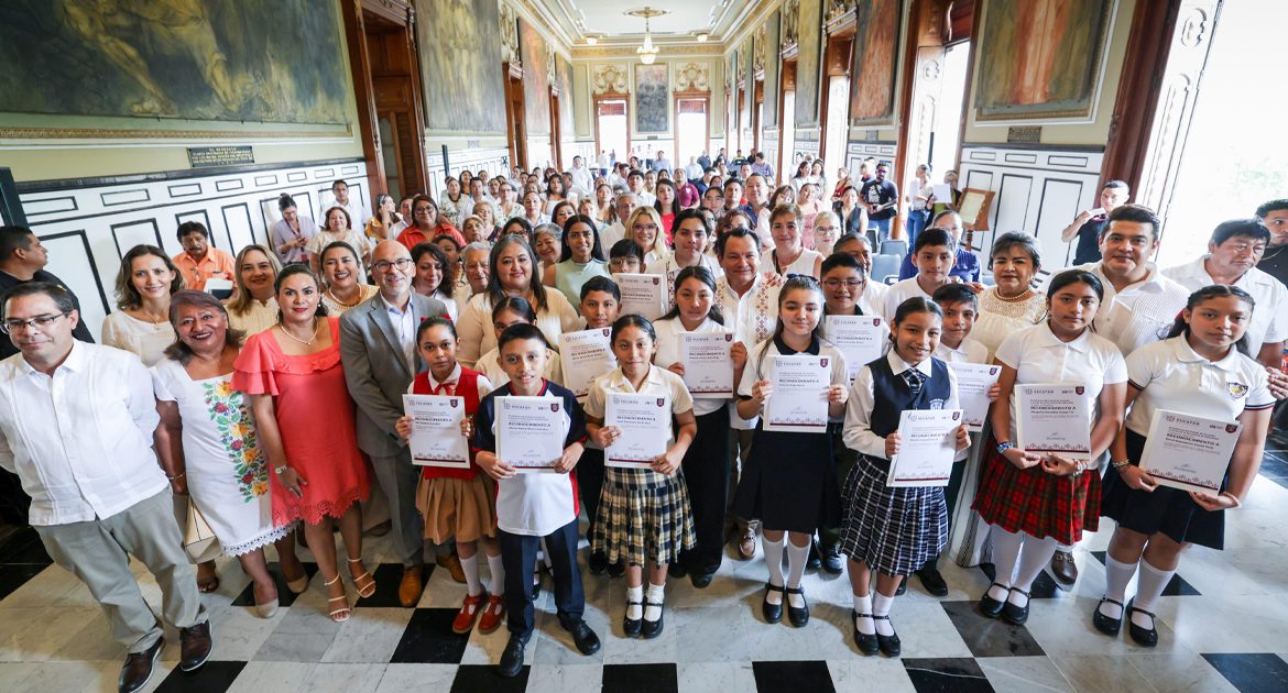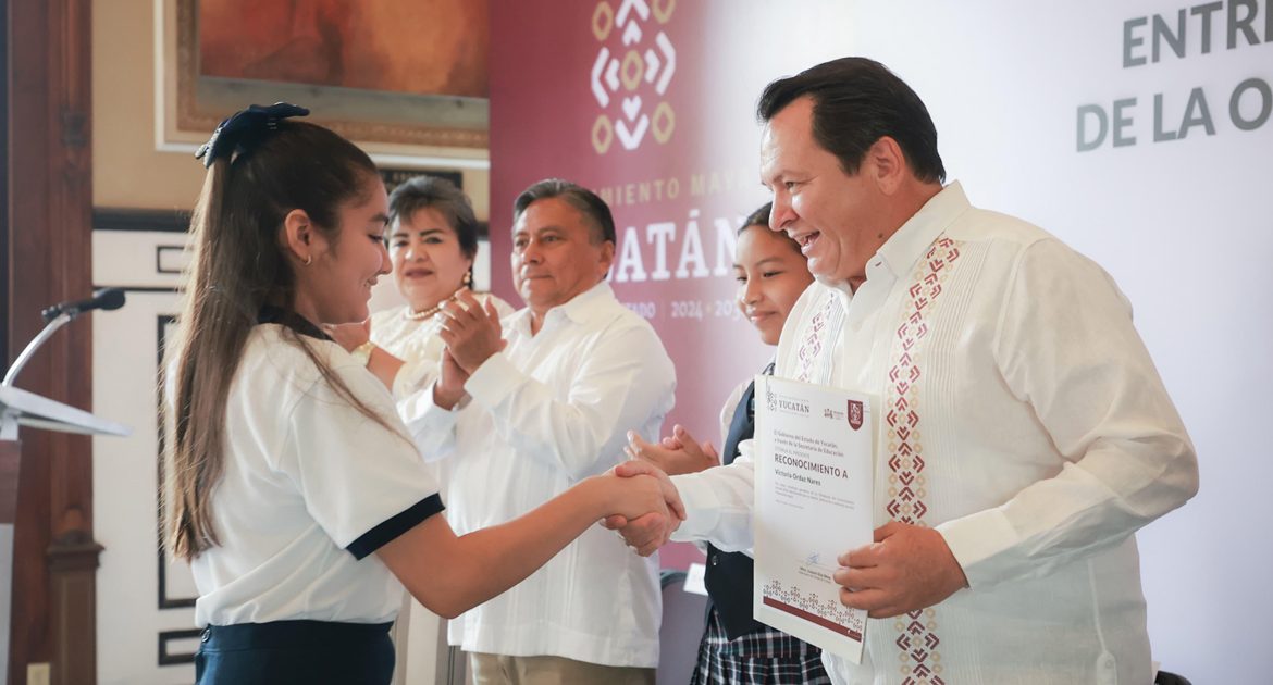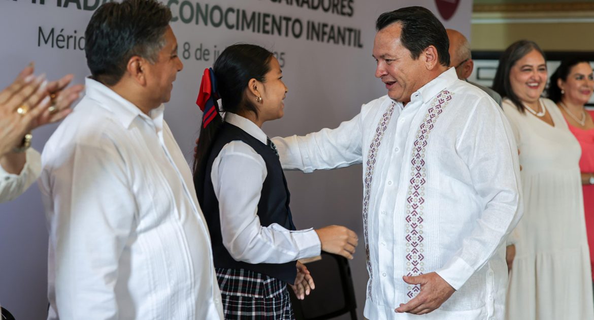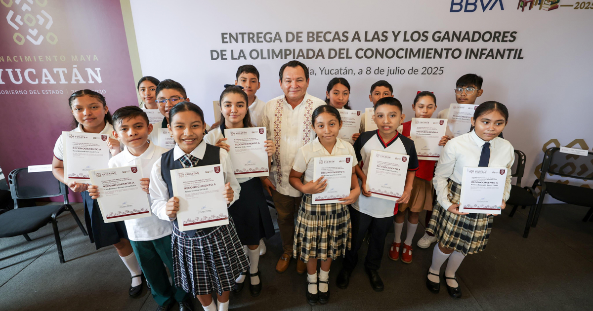 Mérida, Yucatán, 8 de julio de 2025. – El Gobernador Joaquín Díaz Mena entregó reconocimientos a 14 alumnos de sexto grado de primaria, ganadores de la Olimpiada del Conocimiento Infantil 2025. Los estudiantes provienen de escuelas urbanas, rurales, indígenas, particulares y del Conafe.