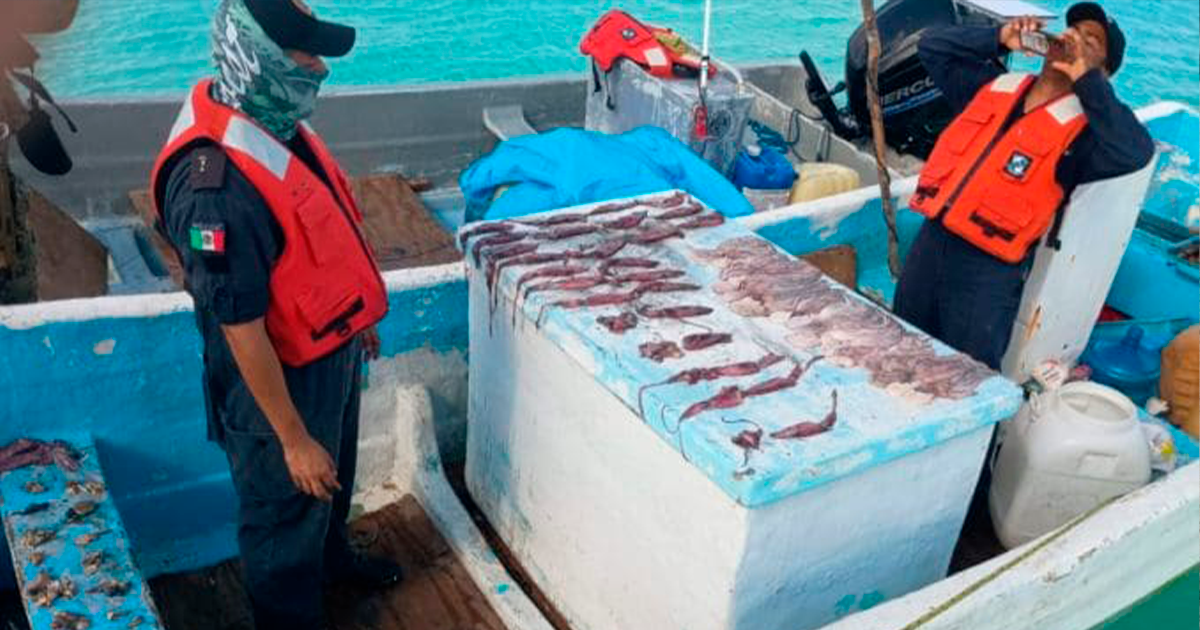 Progreso, Yucatán, 18 de agosto de 2025.- Elementos de la Secretaría de Marina detuvieron a dos pescadores sorprendidos con productos marinos capturados ilegalmente. La intervención ocurrió cerca de la Isla Pérez, al avistar una embarcación menor sin identificación con dos tripulantes a bordo. Durante la inspección, se encontraron cuatro equipos de buceo, 29 piezas de pulpo y 19 calamares, especies actualmente en veda.