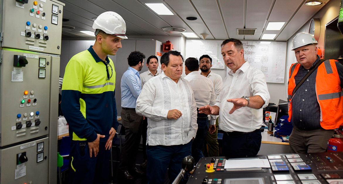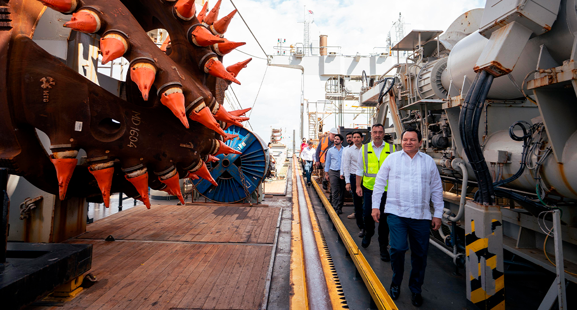 La draga, con tres motores que suman 23 mil kilovatios de potencia, permitirá recibir embarcaciones de mayor tamaño y expandir en más de 200 por ciento el área operativa. Durante el recorrido, las autoridades revisaron los sistemas de corte de roca submarina, bombeo y control central, diseñados para garantizar eficiencia en las labores.