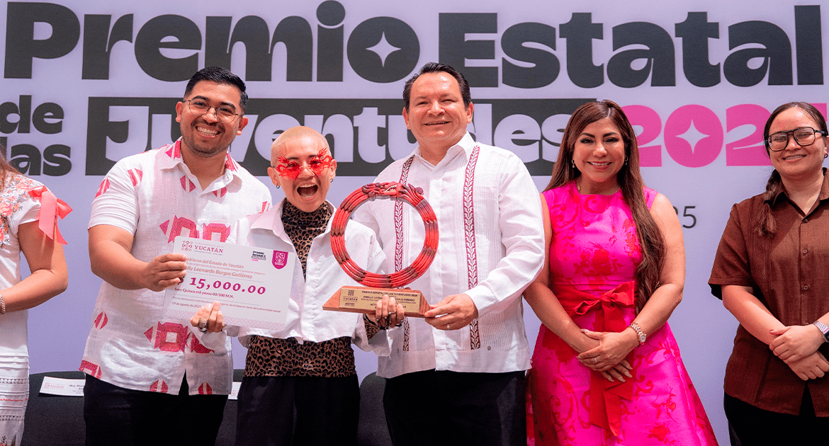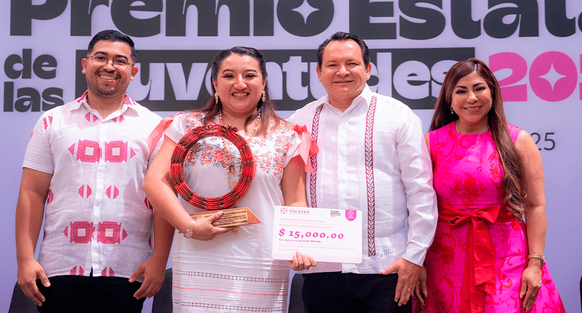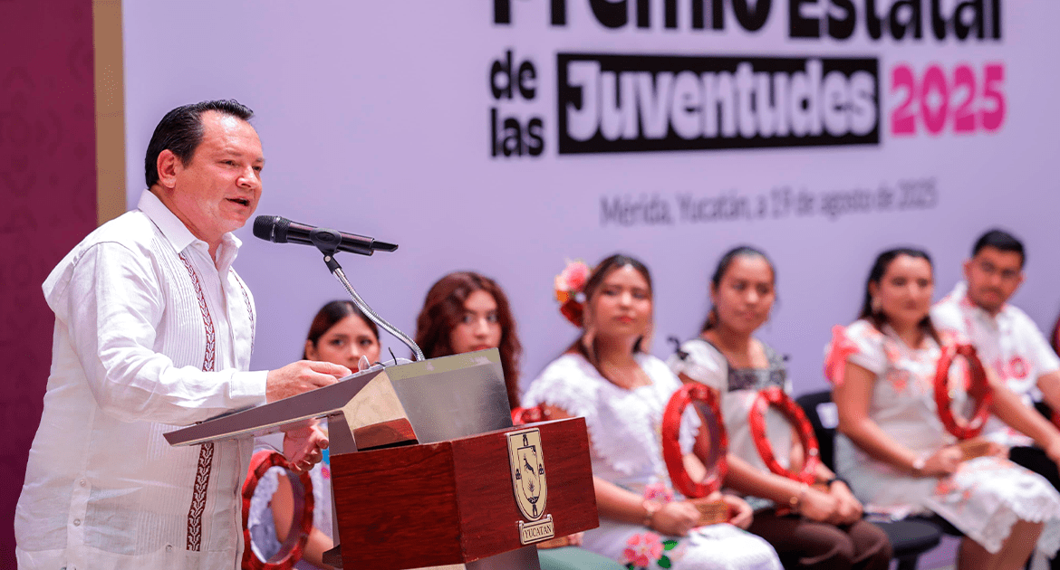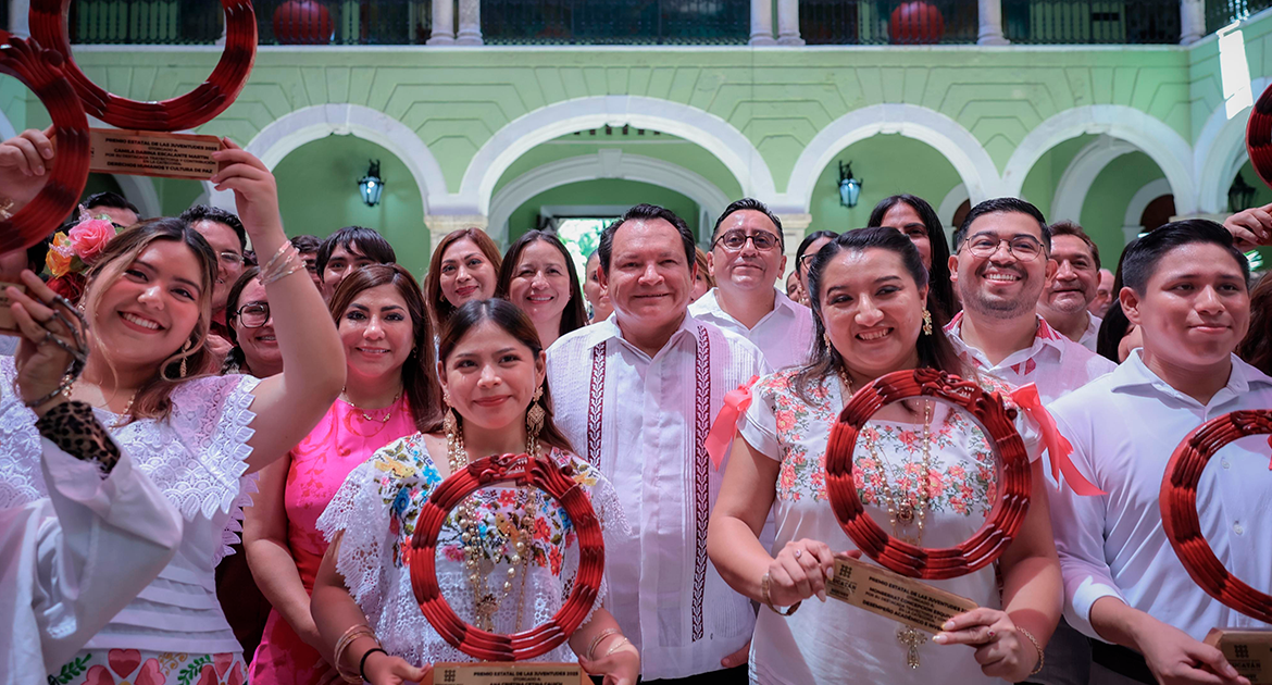 Mérida, Yucatán, 19 de agosto de 2025.- El Gobernador Joaquín Díaz Mena entregó el Premio Estatal de las Juventudes 2025 a diez jóvenes yucatecos en reconocimiento a sus contribuciones en áreas como investigación, arte, cultura, deporte, emprendimiento y defensa de derechos humanos. La ceremonia se realizó en el patio central de Palacio de Gobierno con la presencia de la presidenta honoraria del DIF Yucatán, Wendy Méndez Naal. Los galardonados recibieron incentivos económicos y premios elaborados por artesanos de Yaxcabá.