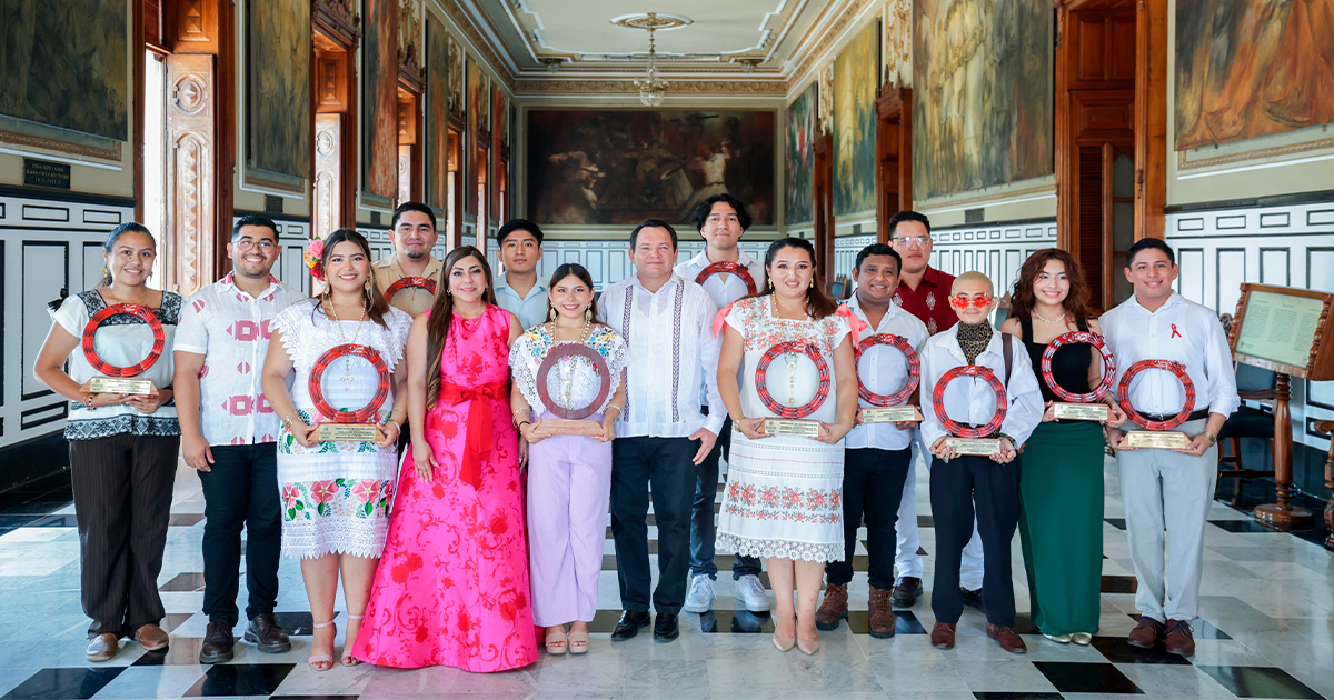 Mérida, Yucatán, 19 de agosto de 2025.- El Gobernador Joaquín Díaz Mena entregó el Premio Estatal de las Juventudes 2025 a diez jóvenes yucatecos en reconocimiento a sus contribuciones en áreas como investigación, arte, cultura, deporte, emprendimiento y defensa de derechos humanos. La ceremonia se realizó en el patio central de Palacio de Gobierno con la presencia de la presidenta honoraria del DIF Yucatán, Wendy Méndez Naal. Los galardonados recibieron incentivos económicos y premios elaborados por artesanos de Yaxcabá.