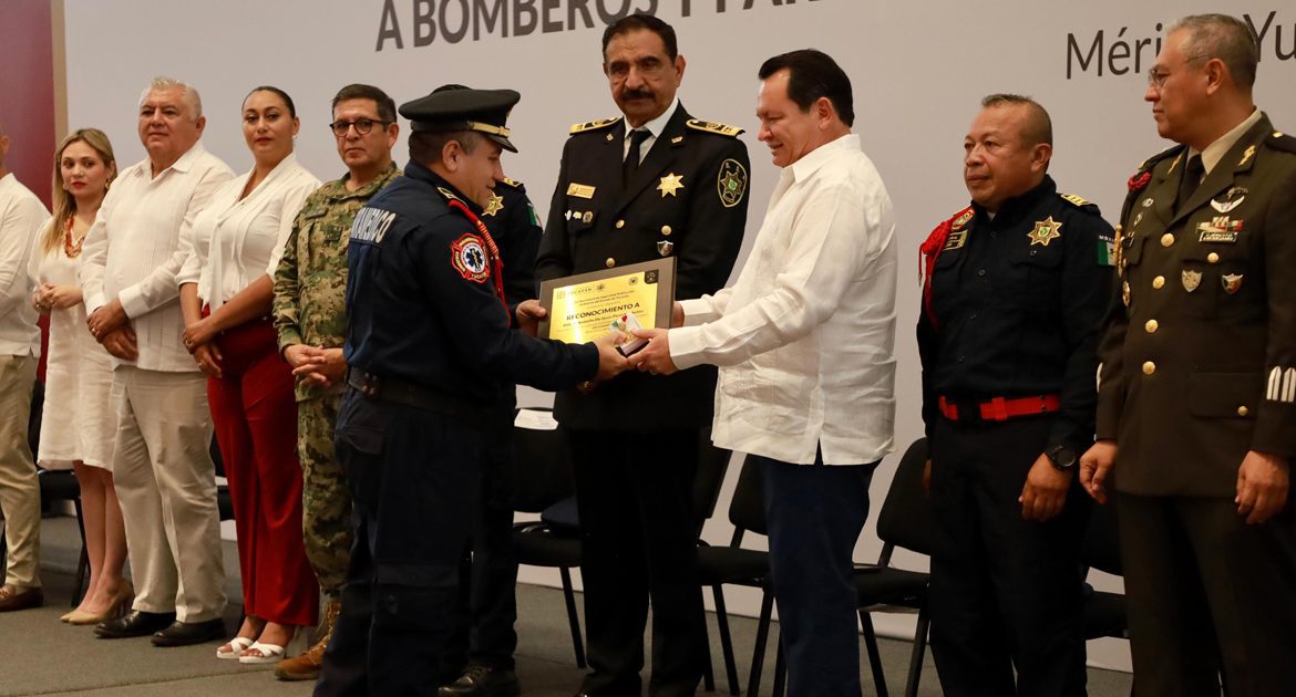 Mérida, Yucatán, 22 de agosto de 2025.- En el marco del Día Nacional del Bombero, el gobernador Joaquín Díaz Mena hizo un reconocimiento a la entrega, valor y servicio de los tragahumos, así como el de los paramédicos de la Secretaría de Seguridad Pública de Yucatán.