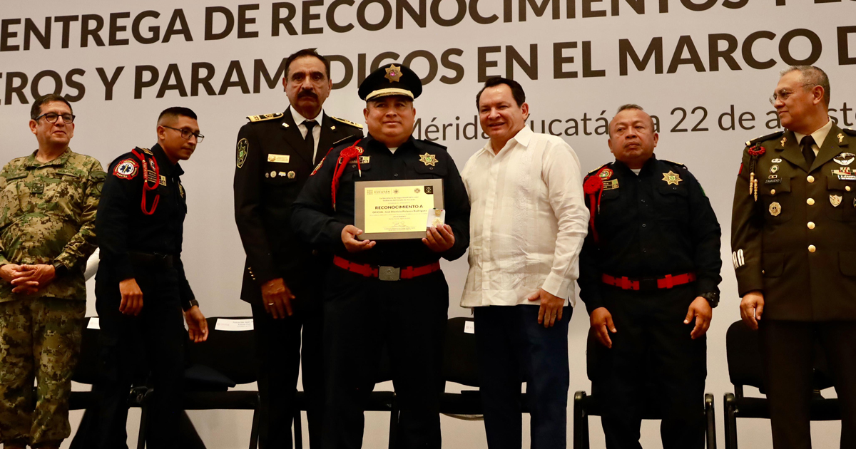 Mérida, Yucatán, 22 de agosto de 2025.- En el marco del Día Nacional del Bombero, el gobernador Joaquín Díaz Mena hizo un reconocimiento a la entrega, valor y servicio de los tragahumos, así como el de los paramédicos de la Secretaría de Seguridad Pública de Yucatán.
