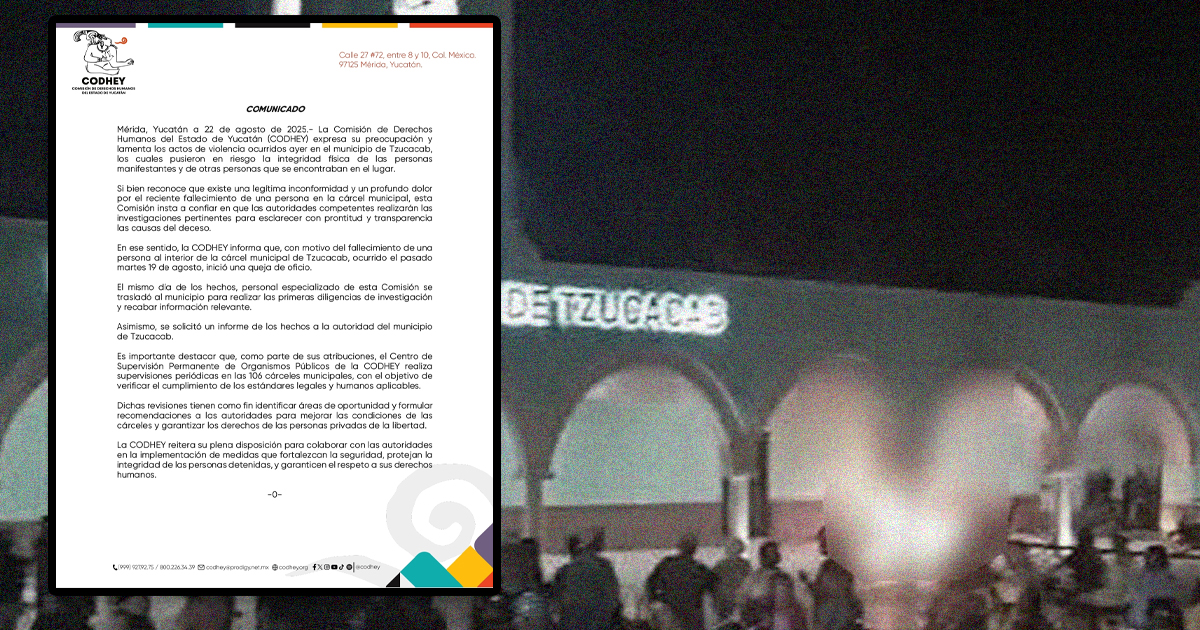 La CODHEY reconoció la legítima inconformidad por el fallecimiento de una persona en la cárcel municipal el pasado 19 de agosto. Instó a confiar en que las autoridades competentes investigarán las causas del deceso con prontitud y transparencia.
