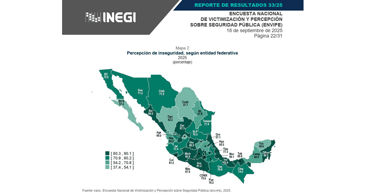El estado comparte este indicador con Baja California Sur (37.4 por ciento) y Coahuila (37.7 por ciento). En contraste, Morelos, Tabasco y Guanajuato registraron porcentajes superiores al 88 por ciento de percepción de inseguridad.