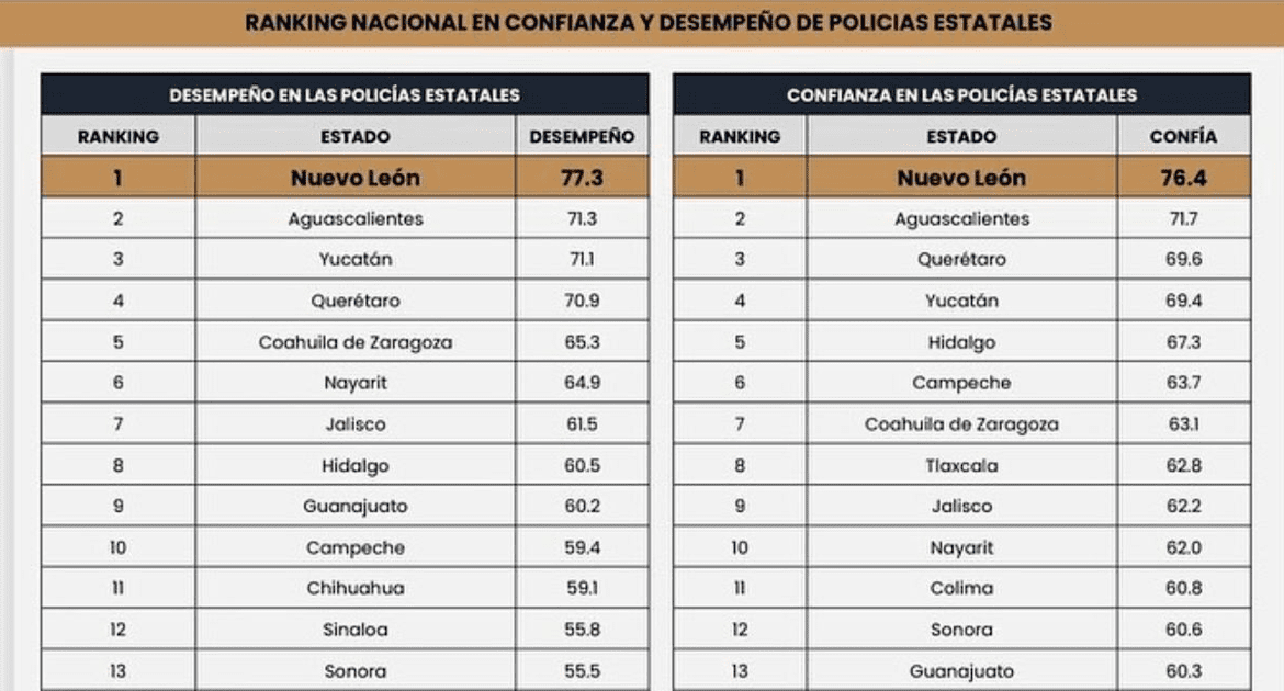 Aguascalientes conserva el segundo lugar en ambos indicadores con 71.3 puntos en desempeño y 71.7 en confianza. Querétaro se sitúa en cuarto lugar en desempeño policial con 70.9 puntos y tercero en confianza con 69.6 puntos. Los cuatro estados se mantienen consistentemente entre los mejor evaluados.