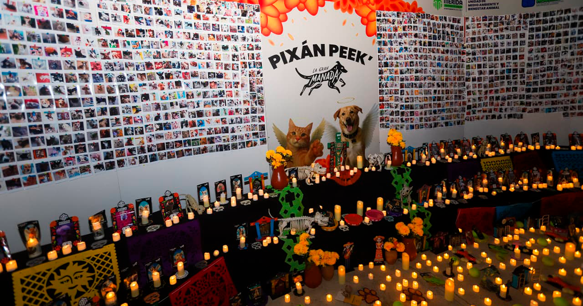 Mérida, Yucatán, 29 de octubre de 2025.- El Parque La Plancha albergó el Pixán Peek 2025, un homenaje a mascotas fallecidas que reunió a cientos de familias meridanas. Los asistentes participaron en un altar colectivo con más de 2 mil fotografías de animales de compañía, adornado con flores, velas y mensajes conmemorativos.