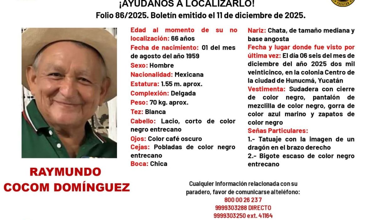 De acuerdo con la ficha de búsqueda de la Fiscalía General del Estado, Folio 86/2025, el hombre fue visto por última vez el 6 de diciembre en la colonia Centro de Hunucmá. En la alerta se detalló que vestía sudadera negra con cierre, pantalón de mezclilla negro, gorra azul marino y zapatos negros, además de que se trataba de una persona de complexión delgada, 1.55 metros de estatura y 66 años de edad.