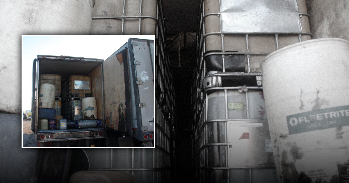 La Policía Federal Ministerial aseguró 33 contenedores con aproximadamente 19 mil 836 litros de mezcla de hidrocarburos. También se incautó un tractor sin placas, una motobomba, una manguera y una caja de tráiler con jaula metálica, como presuntos objetos del delito.