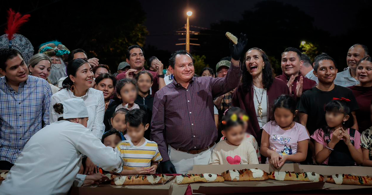 Mérida, Yucatán, 5 de enero de 2026.- El Gobernador Joaquín Díaz Mena anunció la construcción de un domo en el parque Plan de Ayala Sur II de Mérida. El anuncio se realizó durante el tradicional corte de la Rosca de Reyes con vecinos de esa colonia.