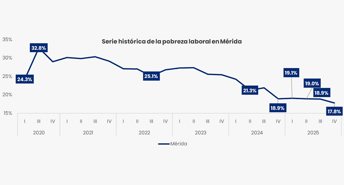 El indicador de pobreza laboral en Mérida alcanzó 17.8 por ciento, lo que representa un mínimo histórico. Esta cifra mide a la población con ingreso laboral inferior al costo de la canasta alimentaria y se ubica muy por debajo de la media nacional de 32.3 por ciento.