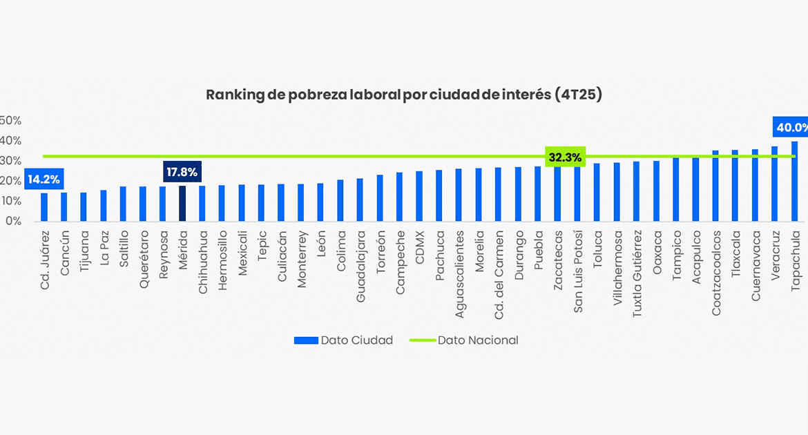 En comparación anual, Mérida registró un decremento de 1.1 puntos porcentuales, al pasar de 18.9 por ciento en 2024 a 17.8 por ciento en 2025. La media nacional tuvo una reducción de 3.1 puntos porcentuales en el mismo periodo.