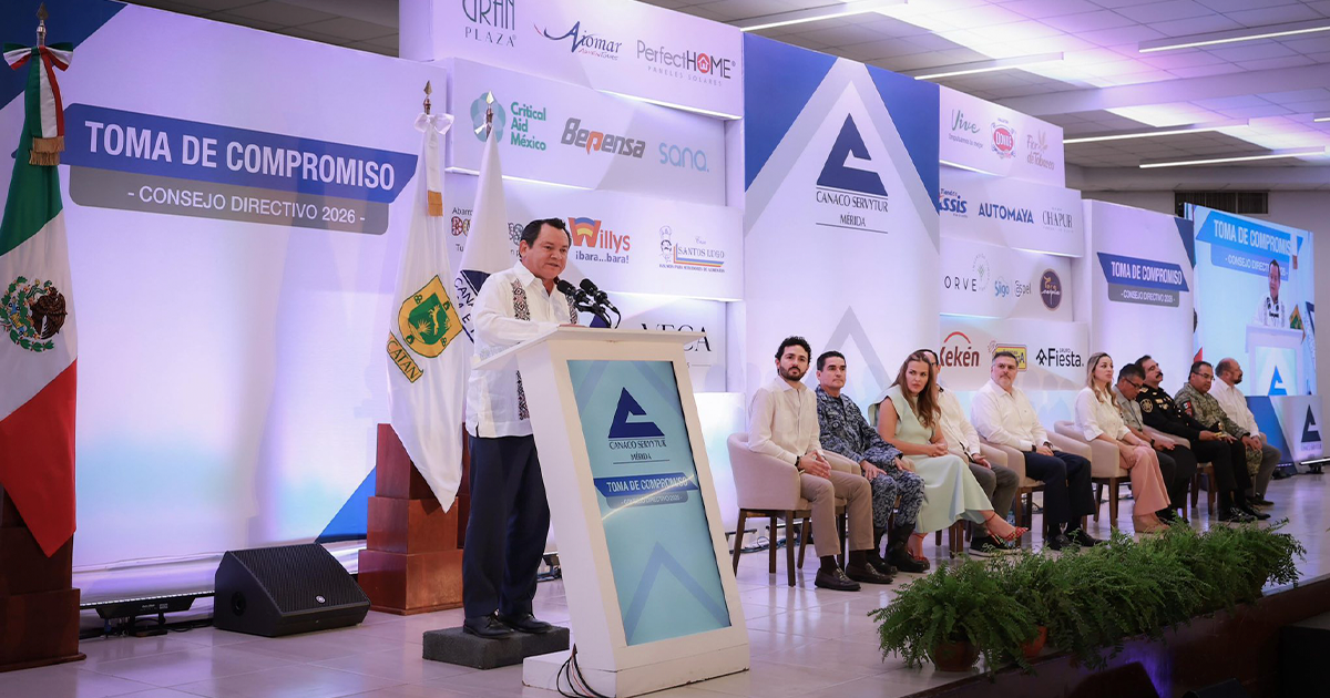 Mérida, Yucatán, 13 de marzo de 2026.- El Gobernador Joaquín Díaz Mena encabezó la toma de compromiso del Consejo Directivo 2026 de la Cámara Nacional de Comercio, Servicios y Turismo de Mérida. El mandatario estatal definió a su administración como aliada permanente de la iniciativa privada y llamó al trabajo conjunto entre los tres órdenes de gobierno y la sociedad civil.